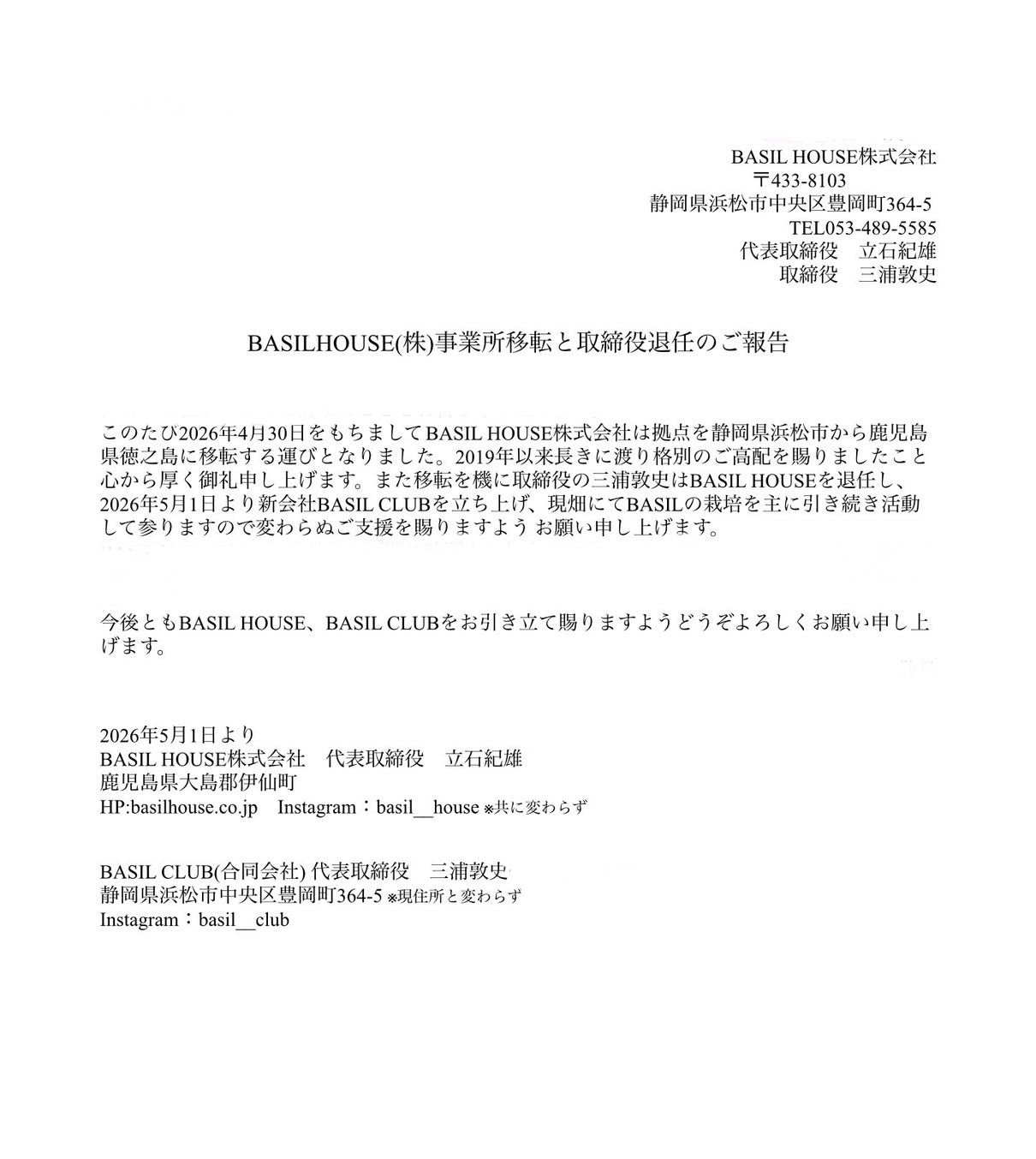 BASIL HOUSEへようこそ!